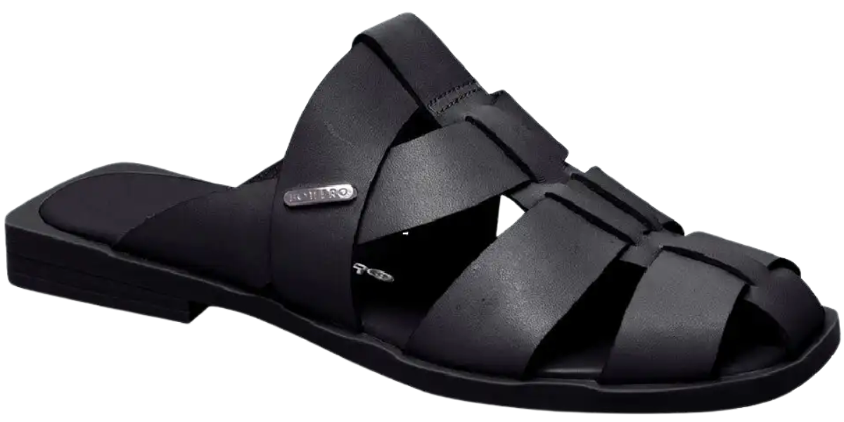 Sandália rasteira em couro atanado na cor preto. De solado rasteiro na cor preto com palmilha na cor preto. O modelo possui tira larga central sobre o pé e tiras largas na horizontal, exibindo parte do pé.